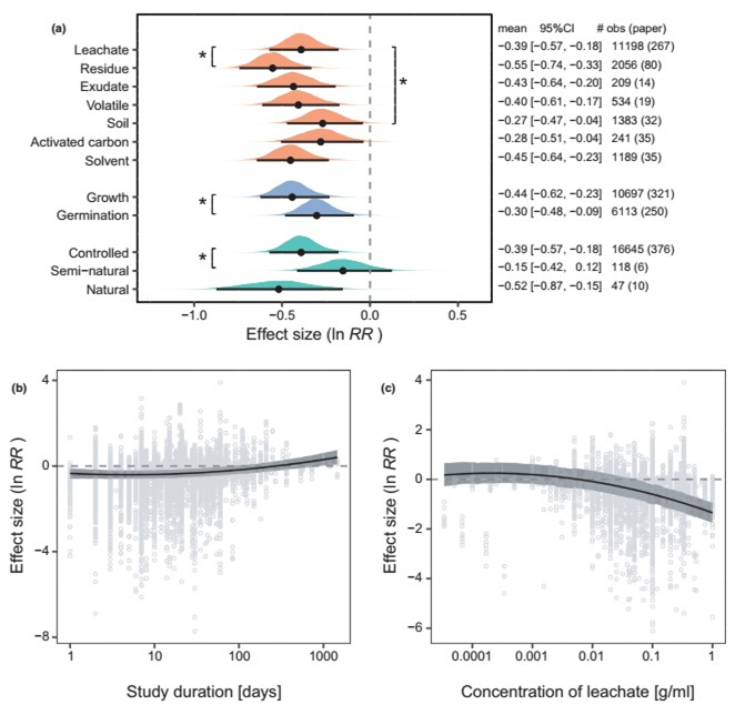 Figure 2 Effects of different aspects of study design on allelopathy. (a) Effects of the type of method (orange), the type of performance measure (blue) and the experimental environment (green) on allelopathy. (b) Effect of study duration on allelopathy. (c) Effect of the concentration of leachates on allelopathy. In (a) for each category (parameter), the posterior distribution is plotted with the mean and 95% credible interval. The text on the right displays the mean, 95% credible interval (CI), and the number of observations (obs) and papers. An asterisk indicates a significant difference between the level of interest and the reference level. In (b) and (c), curves of the estimated effects are shown with their 95% credible intervals. Negative values of the effect size (ln RR) indicate that allelopathy inhibits plant performance.
