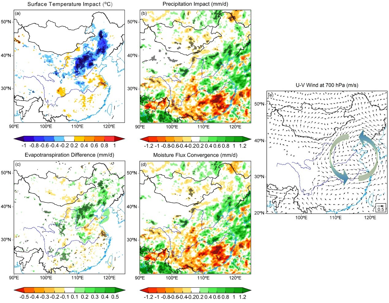 圖1. 植被變綠對近地表氣溫(a),降水(b),蒸散(c),水汽輻合(d)和環(huán)流(e)的影響。
