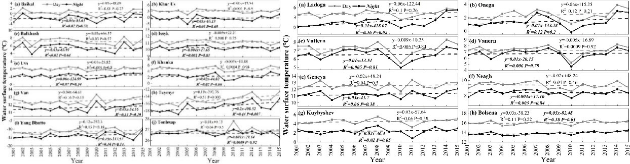 歐亞大陸分布著眾多湖泊和水庫,總面積約占全球內(nèi)陸水體總面積的46%。歐亞大陸地形復(fù)雜,氣候帶分布廣泛,湖泊存在著梯度差異。盡管湖泊溫度研究已在世界范圍內(nèi)進(jìn)行了不同規(guī)模的研究,但湖泊溫度在歐亞大陸湖泊中的分布模式和湖泊溫度差異驅(qū)動(dòng)因素尚待分析。東北地理所水環(huán)境遙感團(tuán)隊(duì)利用MOD11A2產(chǎn)品提取湖泊表面溫度信息,根據(jù)柯本氣候分區(qū)和湖泊面積在歐亞大陸選擇了861個(gè)湖泊和237個(gè)水庫,研究了歐亞大陸湖泊溫度分布格局,并分析了長時(shí)間序列湖泊溫度變化趨勢。研究發(fā)現(xiàn)相對于其他湖泊來說,高緯度和青藏高原的湖溫更低。相比于白天,夜晚的湖泊溫度空間異質(zhì)性更小。在2001-2015年期間,占湖泊總數(shù)70%以上的湖泊溫度呈現(xiàn)明顯的上升趨勢。高緯度湖泊以及熱帶雨林地區(qū)的湖泊,晝夜溫差的變化最小。在影響因素方面,氣溫與湖泊溫度之間的相關(guān)關(guān)系最好(白天R2=0.71;夜間R2=0.87)。另外湖泊的深度、面積、海拔以及水源情況都會(huì)對湖溫產(chǎn)生影響。研究結(jié)果對未來氣候變化情境下湖泊的響應(yīng)、湖泊與大氣之間的熱量交換和開展冰清預(yù)報(bào)等具有重要意義。