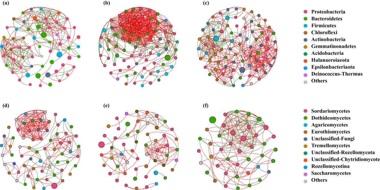 圖1 蟹洞不同部位沉積物微生物共現(xiàn)網(wǎng)絡(luò)