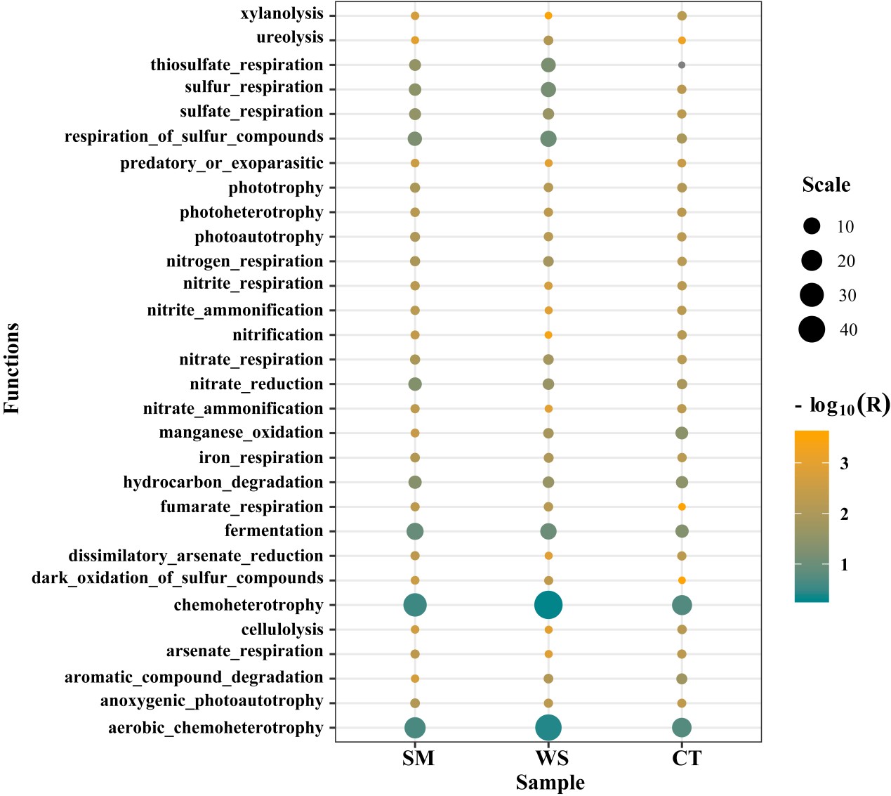 結(jié)果表明,蟹類生物擾動(dòng)改變了沉積物細(xì)菌和真菌的組成豐度,經(jīng)過蟹類生物擾動(dòng)(SM和WS)后細(xì)菌優(yōu)勢菌門Proteobacteria 、Bacteroidetes相對(duì)豐度顯著升高,而Actinobacteria 、Gemmatimonadetes相對(duì)豐度顯著降低;蟹類擾動(dòng)顯著增加了真菌優(yōu)勢菌綱Tremellomycetes的相對(duì)豐度。網(wǎng)絡(luò)分析表明,螃蟹生物擾動(dòng)后真菌網(wǎng)絡(luò)的模塊化程度降低,而蟹類生物擾動(dòng)沉積物(SM和WS)的微生物網(wǎng)絡(luò)聚類系數(shù)高于未經(jīng)擾動(dòng)的沉積物微生物網(wǎng)絡(luò)。同時(shí),細(xì)菌功能類群表現(xiàn)出,洞內(nèi)(WS)中化能異養(yǎng)和好氧化能異養(yǎng)的相對(duì)豐度顯著高于未擾動(dòng)沉積物(CT);而真菌營養(yǎng)群表現(xiàn)為,蟹洞洞口土丘(SM)腐生菌的相對(duì)豐度顯著降低,較洞內(nèi)(WS)和未擾動(dòng)沉積物(CT)分別降低71.55%和57.57%。因此,河口濕地蟹類行為擾動(dòng),能夠顯著改變微生物群落結(jié)構(gòu)和功能類群,從而改變潮間帶濕地沉積物的有機(jī)質(zhì)和營養(yǎng)物質(zhì)循環(huán)的生物驅(qū)動(dòng)機(jī)制,改變鹽沼濕地功能。