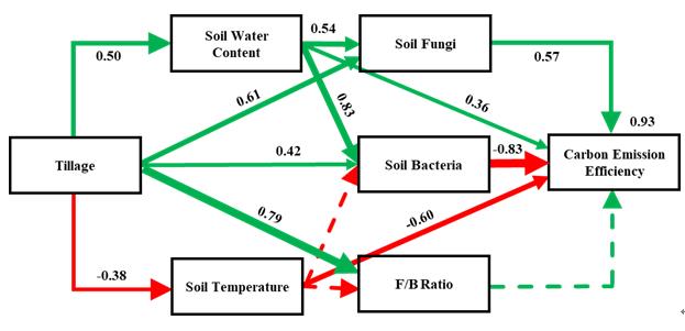 圖2土壤含水量、溫度和土壤微生物與碳排放效率結(jié)構(gòu)方程模型