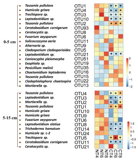 圖3 不同耕作處理下土壤優(yōu)勢真菌OTUs熱圖