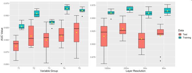 圖1 不同環(huán)境因子組合(T1:氣候因子;T2:氣候+土壤因子;T3:氣候+地形水文因子;T4:全因子;T5:去除因子共線性)和空間分辨率下的模型表現(xiàn)