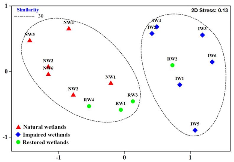 圖1 不同類型濕地水生無(wú)脊椎動(dòng)物群落組成的非度量多維尺度標(biāo)序圖