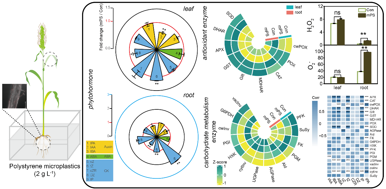 激光共聚焦顯微鏡觀察發(fā)現(xiàn),塑料微粒可以被大麥根系吸收。微塑料在根系中的積累導致根系H2O2和O2-含量升高。利用自主建立的歸一化酶組學分析發(fā)現(xiàn),微塑料顯著增加了大麥根中脫氫抗壞血酸還原酶、谷胱甘肽還原酶、ADP-葡萄糖焦磷酸化酶、果糖激酶、磷酸果糖激酶活性,降低了細胞壁過氧化物酶、液泡轉化酶、蔗糖合酶、磷酸葡萄糖變位酶、6-磷酸葡萄糖脫氫酶、磷酸葡萄糖異構酶活性。而塑料微粒對葉片中的碳水化合物代謝酶活性及活性氧代謝酶活性的影響與根系中的表現(xiàn)不同。此外,微塑料導致大麥葉片中反式玉米素含量升高,而吲哚-3-乙酸、吲哚-3-丁酸、二氫玉米素含量降低。研究人員還發(fā)現(xiàn),碳水化合物代謝和活性氧代謝關鍵酶的變化與植物激素濃度具有顯著相關性。研究結果表明,塑料微粒可嚴重影響作物碳代謝過程和激素調控網絡,對作物生長發(fā)育產生直接影響。因此,未來研究中需更加重視塑料污染對作物生產的影響及其可能造成的生態(tài)安全問題。