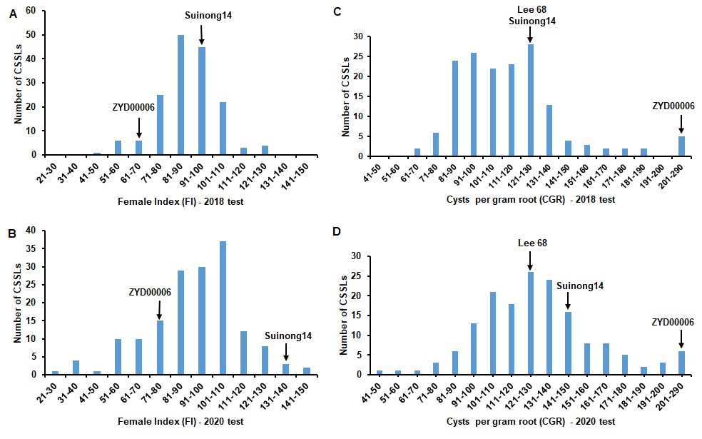 大豆孢囊線蟲病是制約大豆生產(chǎn)的全球性病害之一。大豆孢囊線蟲的抗性是由多基因和數(shù)量性狀控制。大多數(shù)研究是基于高抗和高感品種雜交形成的遺傳分離群體,存在高抗基因時(shí),微效基因時(shí)常被掩蓋而不能被有效檢測(cè)到,然而后代對(duì)線蟲的表型反應(yīng)相對(duì)于親本顯現(xiàn)為廣泛的變異。此外,當(dāng)前對(duì)大豆孢囊線蟲的抗性評(píng)價(jià)是建立在每株孢囊數(shù)與已知感病品種比較所得的雌蟲指數(shù),然而在研究中發(fā)現(xiàn)由于根重大小不一樣,特別是野生品種,僅局限于每株孢囊數(shù)的抗性評(píng)價(jià)對(duì)于育種有一定的局限性。農(nóng)田有害生物控制學(xué)科組王從麗研究員團(tuán)隊(duì)和東北農(nóng)業(yè)大學(xué)陳慶山教授團(tuán)隊(duì)合作首次利用大豆染色體代換系(CSSLs)群體展開了對(duì)大豆孢囊線蟲超親遺傳抗性的研究。