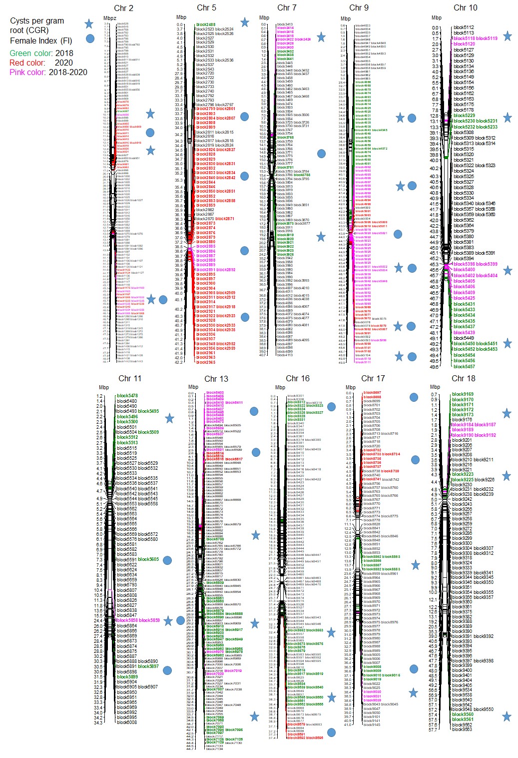 CSSLs是通過供體親本多次反復(fù)與輪回親本回交,然后經(jīng)基因組標(biāo)記輔助選擇后自交獲得的群體,染色體片段的代換能夠通過表型的檢測(cè)準(zhǔn)確的定位與性狀是否相關(guān)。因此,通過表型篩選CSSLs可以有效地識(shí)別并鑒定微效或主效QTLs。該研究所用CSSLs群體是利用野生大豆ZYD00006為供體親本,黑龍江省當(dāng)?shù)氐闹髟云贩N綏農(nóng)14為回交親本的背景,這是我國東北目前唯一一個(gè)大豆代換系群體,同時(shí)這兩個(gè)親本的根重差異比較大,所以是用來評(píng)價(jià)每克根重孢囊數(shù)的理想群體。該研究通過對(duì)162個(gè)代換系群體進(jìn)行表型篩選和高通量測(cè)序,首次報(bào)道了大豆孢囊線蟲每克根孢囊數(shù)(CGR)的QTL定位,也是首次利用CSSLs來評(píng)估大豆孢囊線蟲雌蟲指數(shù)FI和CGR的報(bào)道。表型鑒定發(fā)現(xiàn)代換系的FI和CGR分布范圍很廣,有超親后代(圖1);FI和CGR的相關(guān)性非常低,CGR和根重的相關(guān)性明顯高于FI和根重的關(guān)系。利用單因素標(biāo)記Kruskal-Wallis(K*)分析(P<0.005)及多因子MQM定位方法(LOD>2),總共得到了38個(gè)QTLs(圖2),其分布覆蓋了大豆的20條染色體,這些QTLs具有很強(qiáng)的加性效應(yīng),解釋了SCN5.6-15.5%的FI表型貢獻(xiàn)率,6.1-36.2%的CGR表型貢獻(xiàn)率。其中有25個(gè)QTLs抗性來自于ZYD00006,13個(gè)QTLs來自于綏農(nóng)14,表明感病的雙親對(duì)于超親遺傳都有貢獻(xiàn),同時(shí)間接解釋了SCN抗性的復(fù)雜性及其與目前已經(jīng)報(bào)道分布于所有染色體數(shù)量多于300個(gè)QTLs的原因。研究發(fā)現(xiàn)在缺少SCN主要抗性基因(如rhg1和Rhg4)的情況下,綜合考慮FI、CGR及根重三者有利基因的組合可以有效抑制線蟲繁殖,這對(duì)高效育種具有重要的指導(dǎo)意義。同時(shí)發(fā)現(xiàn)對(duì)SCN有耐性并適合于東北種植的具有綏農(nóng)背景的代換系株系具有潛在的應(yīng)用價(jià)值。