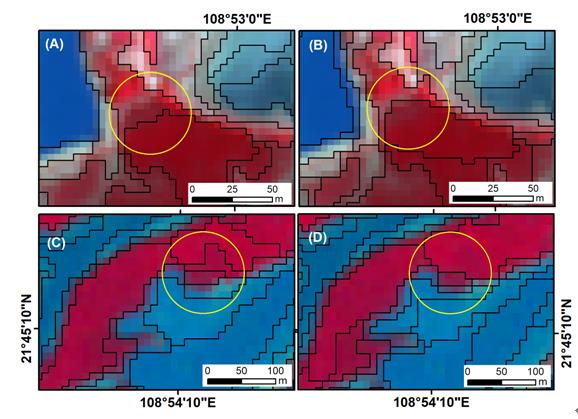 圖2 影像分割中普通分割和最優(yōu)分割結(jié)果對(duì)比。(A)高分-2號(hào)影像的普通分割結(jié)果;(B)高分-2號(hào)影像的最優(yōu)分割結(jié)果;(C)哨兵-2號(hào)影像的普通分割結(jié)果;(D)哨兵-2號(hào)影像的最優(yōu)分割結(jié)果。