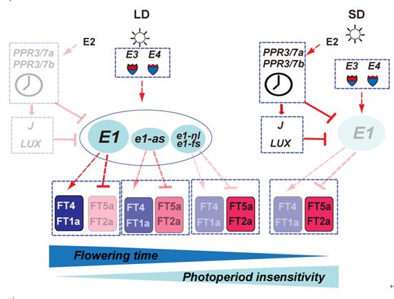1920年研究者發(fā)現(xiàn)了大豆等植物可度量日照長度調節(jié)開花的現(xiàn)象即著名的植物光周期現(xiàn)象。隨后,控制大豆開花遺傳因子被相繼發(fā)現(xiàn),主要基因位點于上個世紀七十年代被定名。在大豆光周期發(fā)現(xiàn)百年華誕之際,我們回溯了E1、E2與E3等主要生育期基因的克隆歷程(圖1)。通過經(jīng)典的圖位克隆方法,于2009年成功地克隆了E3基因 (Watanabe et al., 2009); 2011年克隆了E2基因 (Watanabe et al., 2011),于2012年成功地克隆了E1基因(Xia et al., 2012)(圖2)。特別是E1基因的成功克隆,為大豆光周期發(fā)現(xiàn)以來的重要突破,展示了大豆具有與其他植物在光周期反應上不同的特異性調控機制,為進一步精細解析大豆光周期反應的分子調控機理奠定了重要的基礎。自成功克隆E1基因以來,研究者相繼也成功地克隆了了與生物鐘相關的PRR3a、LUX及J 等重要生育期調控因子,豐富了已明確的E1-FTs通路(圖3)。為此,進一步鑒定調控生育期的新基因與進一步研究生育期基因間精細調控網(wǎng)絡有助于人們最終破解大豆光周期反應的分子本質及明晰大豆適應不同緯度的精細分子機制。