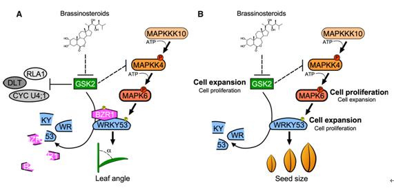 該團隊在前期的工作中發(fā)現(xiàn),OsWRKY53正調控水稻粒型和葉傾角的大小,是水稻BR信號的正調控因子;OsMAPK6能夠磷酸化OsWRKY53,而且OsMAPK6對OsWRKY53的磷酸化能夠增強OsWRKY53的生物功能。在此基礎上,通過分析OsWRKY53與OsMAPKKK10-OsMAPKK4-OsMAPK6組分的雙突變體表型,在遺傳學上證明OsWRKY53是MAPK信號的底物,能夠參與調控水稻葉傾角和粒型。