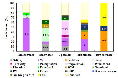 黃河是世界第五大長河,中國第二長河,黃河碳傳輸對亞洲河流碳循環(huán)具有重要影響。中國科學院東北地理與農業(yè)生態(tài)研究所水環(huán)境遙感學科組的科研人員對黃河流域水體DOC進行了野外調查采樣,發(fā)現黃河干流不同河段水體中DOC濃度具有明顯差異(p < 0.01),中游河段水體DOC濃度明顯高于其他河段(4.13 ± 0.91 mg/L)。同時基于碳穩(wěn)定同位素技術解析了黃河水體中DOC來源,分析結果表明黃河源頭和上游水體中的DOC主要來源于陸生性植物貢獻(94%,61%),但是中游和下游DOC主要來源于土壤有機物質(36%,37%),并且在中下游河段,生活污水對河水DOC的貢獻也明顯增多(17%-18%)。在黃河源頭和上游河段,河水中DOC濃度主要受自然因素影響,包括流域坡度和蒸發(fā)量等;在中游和下游河段,河水中DOC濃度主要受工業(yè)廢水排放量和化肥施用量的影響(圖1)。本研究結果有助于進一步理解在人類干擾導致的黃河水體碳輸送特征變化的背景下,平衡發(fā)展與保持環(huán)境可持續(xù)性的重要性。同時,本研究為進一步開展河流碳循環(huán)研究工作奠定了堅實基礎。