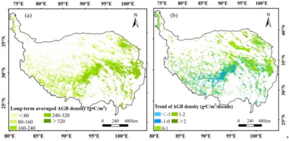 圖1 2000-2019年青藏高原沼澤濕地植被地上生物量密度多年平均及變化趨勢