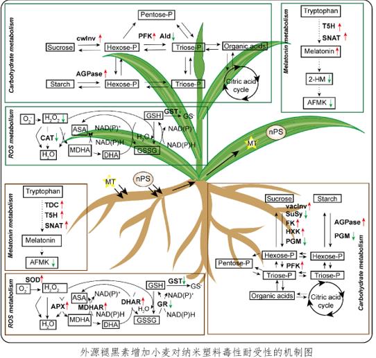 東北地理所作物生理與栽培學(xué)科組研究人員以小麥為研究對象,針對褪黑素影響聚苯乙烯納米微粒吸收、轉(zhuǎn)運(yùn)及生理作用進(jìn)行了研究。借助激光共聚焦和掃描電鏡觀察發(fā)現(xiàn),聚苯乙烯納米微粒可以被小麥根系吸收,并且當(dāng)小麥根系暴露于褪黑素和聚苯乙烯納米微粒的混合溶液中時(shí),小麥葉片和根系中聚苯乙烯納米微粒的積累量減少。RT-qPCR分析表明,外源褪黑素能夠調(diào)節(jié)葉片中水通道蛋白相關(guān)基因TIP2-9、PIP2、PIP3和PIP1.2的表達(dá)以及根系中TIP2-9、PIP1-5、PIP2和PIP1.2的表達(dá)。針對褪黑素處理減少聚苯乙烯納米微粒對小麥影響的生理機(jī)制,研究人員從內(nèi)源褪黑素代謝、碳水化合物代謝、活性氧代謝等三個(gè)方面對暴露于聚苯乙烯納米微粒的小麥葉片和根系進(jìn)行進(jìn)一步的分析。結(jié)果表明,施加的外源褪黑素參與小麥植株對聚苯乙烯納米微粒的響應(yīng),但不依賴于內(nèi)源褪黑素代謝;同時(shí),外源褪黑素施加還可以通過改變多種抗氧化酶活性(包括CAT、GST、APX、MDHAR、DHAR、GR和SOD)維持聚苯乙烯納米微粒造成的氧化脅迫下小麥的氧化還原穩(wěn)態(tài)平衡,并且通過改變碳水化合物代謝水平,保證小麥生長所需的物質(zhì)和能量供應(yīng),從而增強(qiáng)植株對聚苯乙烯納米微粒毒性的耐受性。