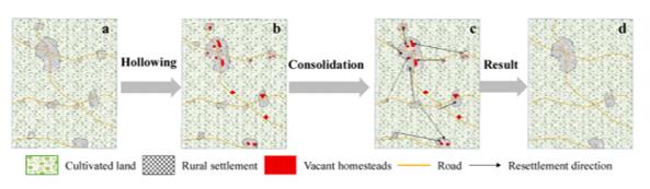 針對(duì)鄉(xiāng)村居民點(diǎn)“破碎化”和日益突出的村莊“空心化”問題,研究組提出一種在村域尺度上對(duì)居民點(diǎn)優(yōu)化重組的“整小填大”新模式。主要做法是引導(dǎo)長(zhǎng)期在城鎮(zhèn)居住的農(nóng)戶有償退出閑置宅基地,將小面積居民點(diǎn)內(nèi)的農(nóng)戶通過宅基地置換的方式搬遷到大面積居民點(diǎn)的閑置宅基地內(nèi),并將小居民點(diǎn)內(nèi)宅基地全部騰退出來后進(jìn)行整理和復(fù)墾。