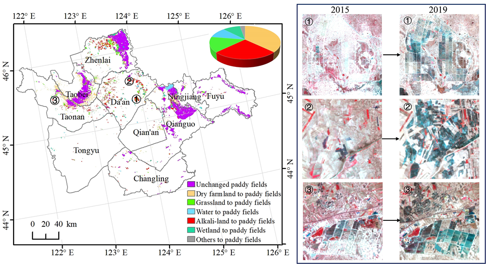鹽堿地在吉林西部分布廣泛,面積約為160多萬公頃,是吉林省為國家增產(chǎn)千億斤糧食能力的重要土地后備資源.目前,隨著鹽堿地種稻技術(shù)的日趨成熟以及國家和地方政策的支持,近年來,吉林西部大面積的鹽堿地正在向水稻田轉(zhuǎn)變(圖1)。鹽堿地改良種稻極大地改變了地表生物地球物理特征,顯著影響地表和大氣之間的能量和水分交換過程。研究和評估鹽堿地變化通過改變地表水熱分配格局來影響區(qū)域氣候的效應(yīng)和機(jī)理,對于揭示以人類活動為主導(dǎo)的土地利用變化在全球和區(qū)域氣候變化中的貢獻(xiàn),科學(xué)認(rèn)識并預(yù)估鹽堿地種稻對區(qū)域生態(tài)環(huán)境的影響都具有重要意義。然而,目前針對鹽堿地種稻的空間格局及其對區(qū)域氣候的影響方面尚缺乏充分的評估。