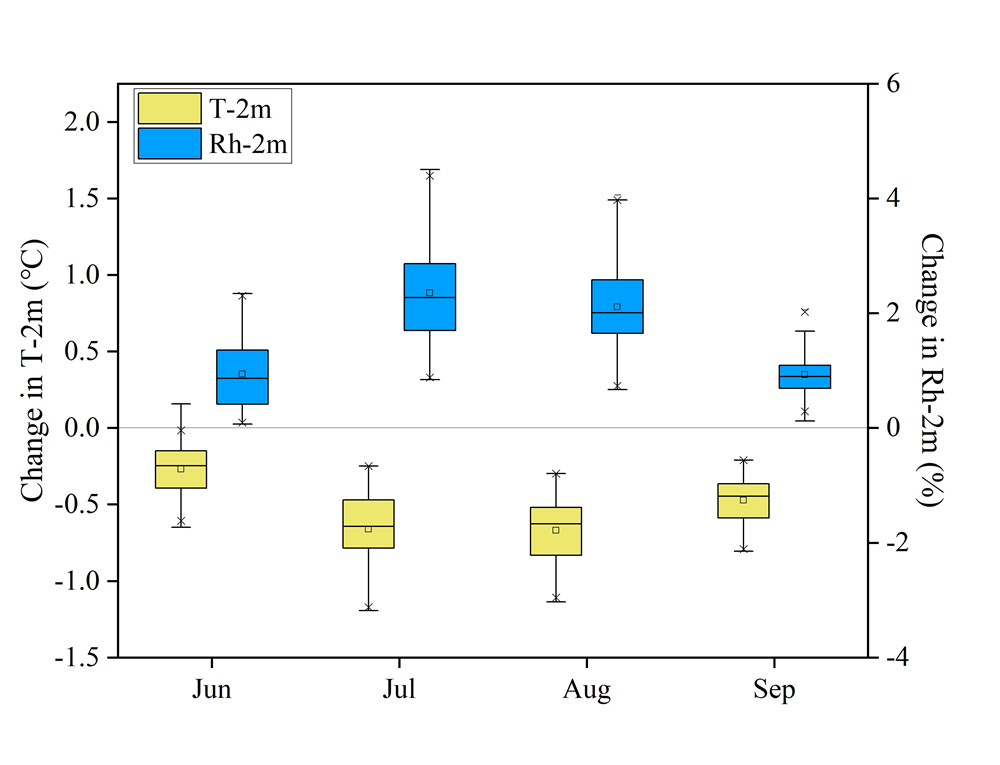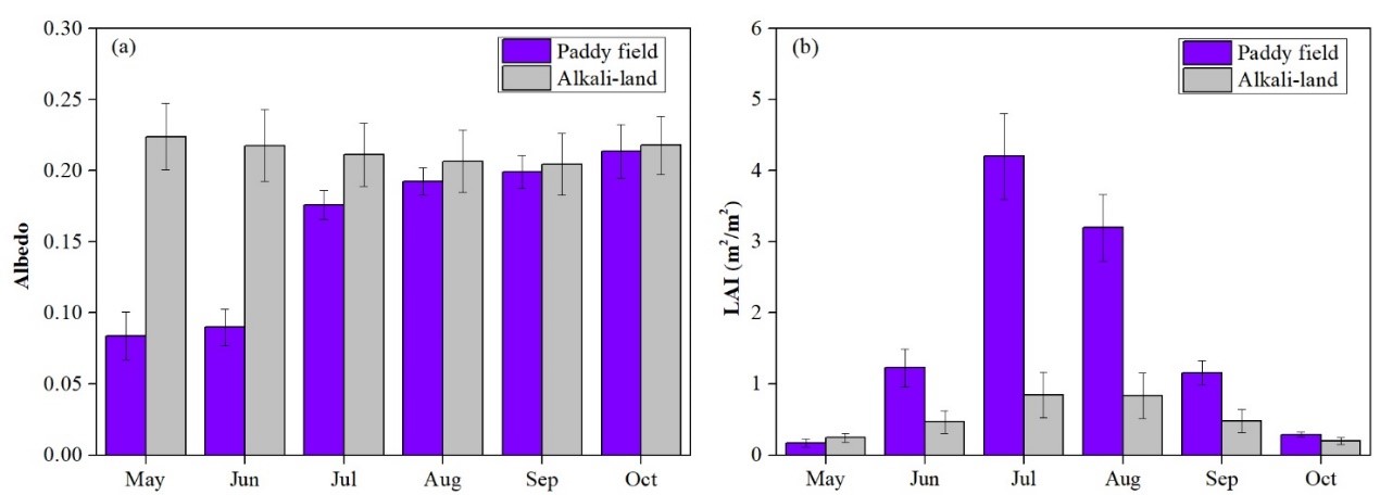 東北地理所土地系統(tǒng)遙感學(xué)科組研究人員,通過耦合地面氣象觀測數(shù)據(jù)、衛(wèi)星遙感觀測數(shù)據(jù)和區(qū)域氣候模式情景模擬的方式,系統(tǒng)評估了吉林西部鹽堿地轉(zhuǎn)變?yōu)樗咎锿ㄟ^改變地表參數(shù)主要是葉面積指數(shù)和反照率,進(jìn)而影響局地氣溫和相對濕度的效應(yīng)和生物地球物理機(jī)制。基于遙感觀測的研究結(jié)果表明,鹽堿地種稻使葉面積指數(shù)顯著增加,主要集中在生長季七月和八月;受水稻田灌水的影響,鹽堿地種稻會導(dǎo)致五、六月份反照率顯著降低。生長季內(nèi),葉面積指數(shù)和反照率對鹽堿地種稻的響應(yīng)差異直接影響著地表輻射過程和非輻射過程的權(quán)衡。