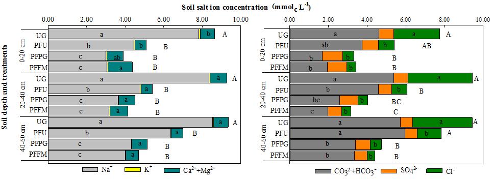 圖1 不同改良耕作處理10年的土壤鹽分離子含量變化