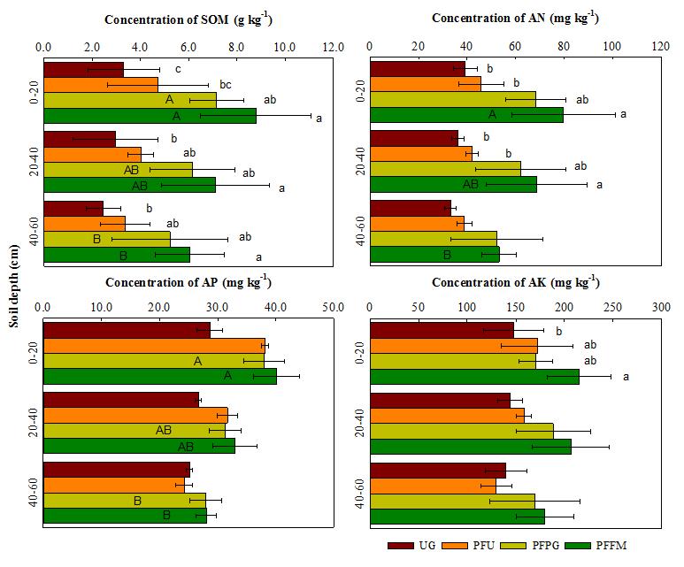 圖2不同改良耕作處理10年的土壤有機(jī)質(zhì)和速效養(yǎng)分含量變化