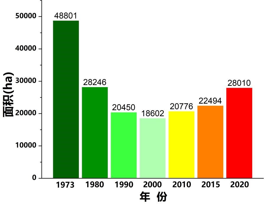 研究表明,近50年中國(guó)紅樹林面積先減少后增加,如圖2所示。其中1973-2000年中國(guó)紅樹林減少了30199 ha,約62%的紅樹林消失;2000-2020年紅樹林面積增加9408 ha,增長(zhǎng)51%。2020年中國(guó)紅樹林的總面積基本恢復(fù)到1980年水平。