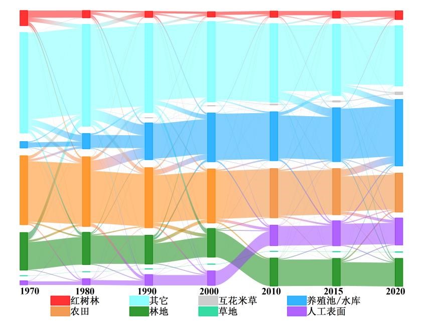圖3. 1973-2020年紅樹林生長(zhǎng)區(qū)土地覆蓋類型相互轉(zhuǎn)化