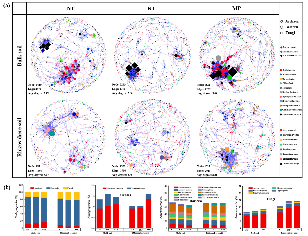 東北地理與農(nóng)業(yè)生態(tài)研究所農(nóng)田分子生態(tài)學科組和黑土有機碳與保護性耕作學科組,對免耕(NT)、少耕(RT)和傳統(tǒng)耕作(MP)處理下土壤微生物群落組成、裝配過程和分子網(wǎng)絡結構進行解析,探討了保護性耕作下黑土農(nóng)田土壤微生物群落結構演替及發(fā)生機制對土壤質量和作物生產(chǎn)力的影響。研究結果表明,不同耕作方式顯著改變了根際和非根際土壤微生物群落,與傳統(tǒng)耕作MP相比,保護性耕作NT和RT顯著增加了硝化菌Nitrosospira sp.和固氮菌Mesorhizobium sp., Bradyrhizobium sp.和Burkholderia sp.相對豐度,但降低了具有有機質物分解功能的Blastococcus sp., Streptomyces sp.和Sphingomonas sp.相對豐度。網(wǎng)絡分析和隨機森林分析發(fā)現(xiàn),上述功能菌在NT和RT處理中被注釋為關鍵物種(keystone taxa),這表明保護性耕作更有助于土壤碳固定,并促進土壤的生物固氮和硝化作用(圖1)。