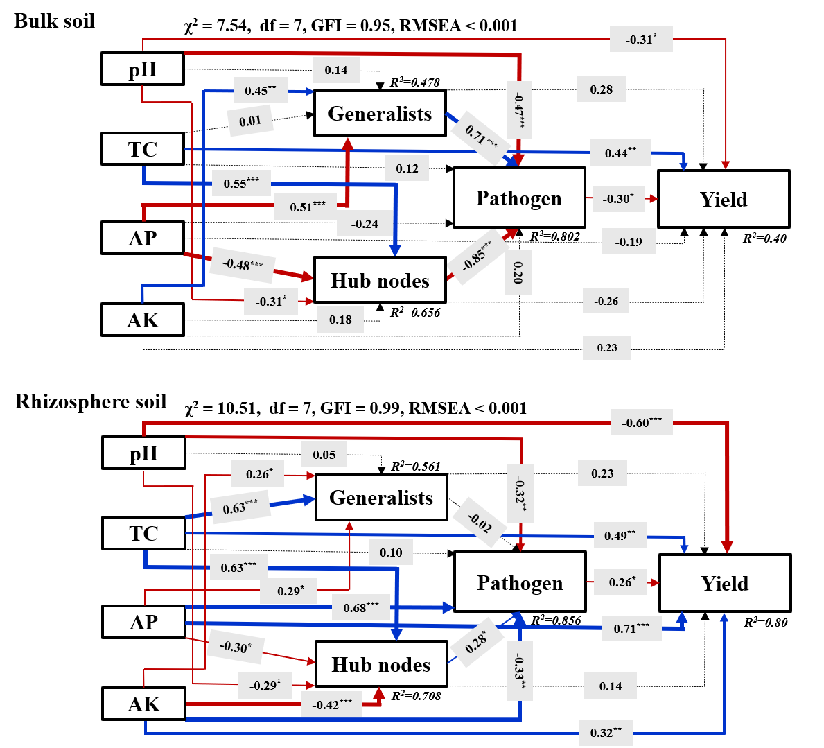 耕作方式顯著改變了土壤微生物群落的裝配過程。MP處理下細菌群落裝配的隨機過程,特別是同質性擴散(homogenizing dispersal),顯著高于NT和RT,這可能是由于MP較強的土壤擾動,導致微生物的擴散速率增加(圖2)。微生物分子生態(tài)網(wǎng)絡表明,RT較NT和MP形成更穩(wěn)定的網(wǎng)絡結構,且RT有助于提高關鍵物種(keystone taxa)介導的土壤養(yǎng)分有效性,緩解植物病原菌的生態(tài)風險,而MP網(wǎng)絡中的核心物種大多為潛在的植物病原菌。結構方差模型(SEM)分析結果顯示,MP處理引起潛在病原微生物及相互間正向關聯(lián)性作用,而RT處理具有較穩(wěn)定的微生物網(wǎng)絡結構,無效的病原菌傳播路徑減少,導致RT產(chǎn)量高于MP(圖3)。