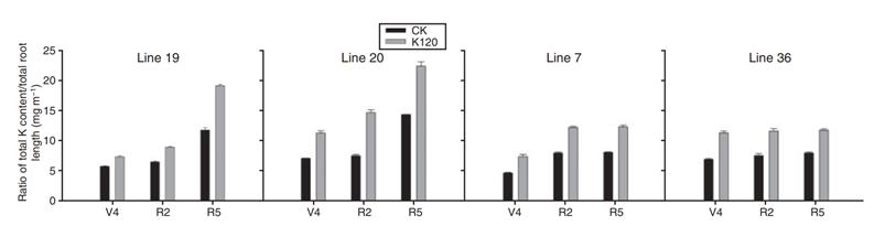 基于以上科學問題,大豆分子育種學科組張秋英研究員團隊通過對40個不同鮮食大豆品種(系)進行了鉀效率鑒定試驗,從中篩選出了代表性的鉀高效型材料進行了進一步的形態(tài)生理特征及其內(nèi)在機制解析。研究發(fā)現(xiàn),從鉀素的利用角度,低鉀條件下鉀高效型品種對鉀素的積累及干物質(zhì)的分配調(diào)控能力更強,表現(xiàn)出優(yōu)先供給庫器官,因而具有較高的收獲指數(shù)(HI)及鉀收獲指數(shù)(KHI)(圖1)。同時,低鉀對鉀高效型品種的光合參數(shù)、葉面積影響較小,對比葉重影響較大,促進葉綠素a/葉綠素b比值顯著增加。因此,低鉀環(huán)境下的強適應性及調(diào)節(jié)能力是影響鮮食大豆鉀素利用效率的關鍵;鉀素的吸收效率方面,鉀高效型鮮食大豆應對低鉀環(huán)境其根系的形態(tài)調(diào)節(jié)能力更強,通過增加總根長及側(cè)根數(shù)來增加根系與土壤的接觸面積,如鉀高效型材料側(cè)根數(shù)相比對照材料可高出30%,進而增強了植株鉀素的獲取能力。同時,鉀高效型材料的單位根長吸鉀量更高(圖2),在低鉀環(huán)境下根系活力、傷流量與鉀流量顯著增加,進一步保證了鉀素、水分及營養(yǎng)物的供應。轉(zhuǎn)錄組分析結果顯示,鉀高效型鮮食大豆根系在低鉀條件下受生長素信號調(diào)控的側(cè)根發(fā)育通路存在正向調(diào)控(圖3),同時與鉀素吸收利用密切相關的鉀離子通道基因AKT1及鉀轉(zhuǎn)運體基因HAK5基因的同源基因在鉀高效型材料根系中高量表達,這可能是影響根系形態(tài)調(diào)節(jié)及鉀離子吸收動力增加的重要內(nèi)因(圖4)。以上研究結果將為鉀高效型作物品種選育提供理論依據(jù),進而也為實現(xiàn)黑土保育、資源高效持續(xù)利用提供重要支撐。