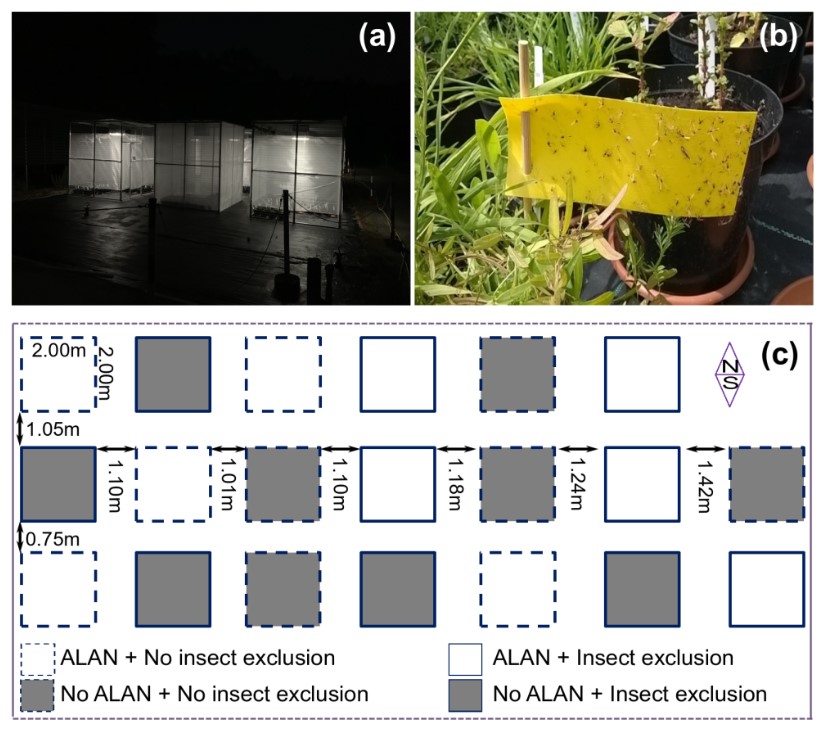 針對以上研究空白,中科院東北地理所生物入侵生態(tài)學(xué)研究團隊劉艷杰研究員聯(lián)合德國康斯坦茨大學(xué),進行了夜間路燈(有與無)×昆蟲排除(排除與不排除)全因子實驗,對比外來植物和本地植物中的常見種(廣幅分布且在群落中占據(jù)優(yōu)勢)與稀有種(窄幅分布且在群落中不占優(yōu)勢)對夜晚燈光和昆蟲采食的響應(yīng)特征。