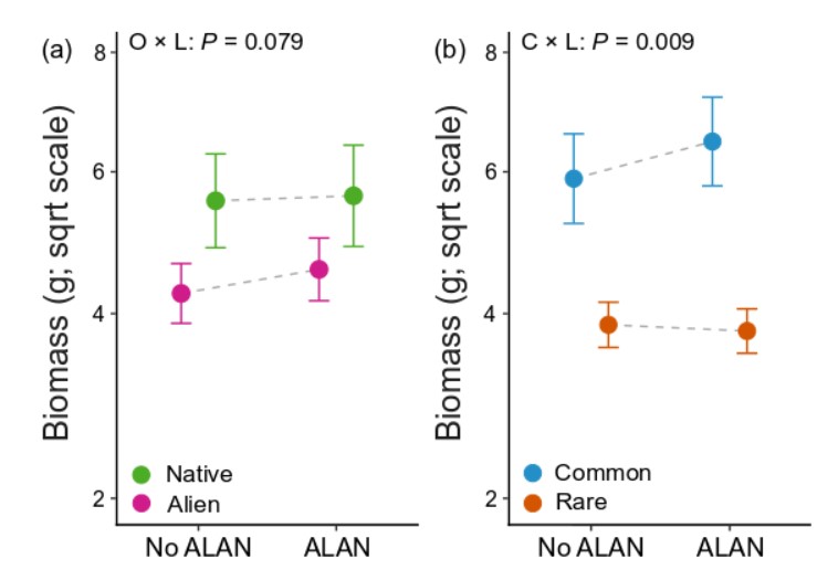 圖二:在有無夜晚光照處理下,外來種和本地種(a)、以及常見種和稀有種(b)的生物量