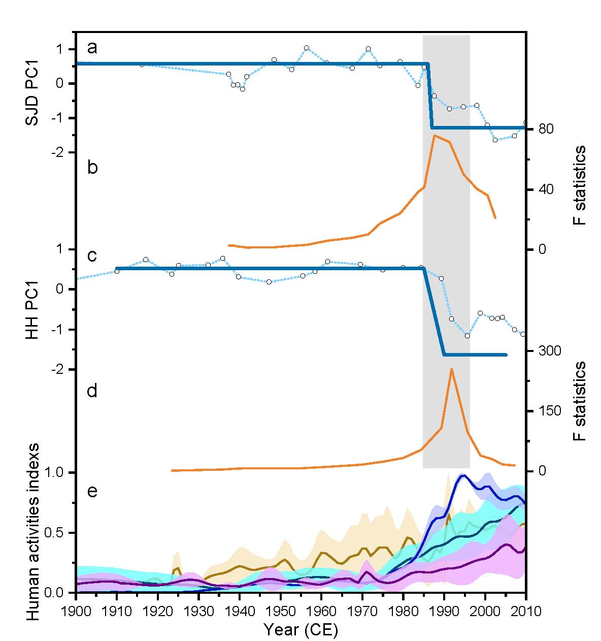 為探索是否可以利用濕地沉積記錄揭示生態(tài)系統(tǒng)的彈性和適應(yīng)性循環(huán)機(jī)制并指導(dǎo)制定濕地恢復(fù)目標(biāo),中國(guó)科學(xué)院東北地理與農(nóng)業(yè)生態(tài)研究所濕地演化與生態(tài)功能學(xué)科組的科研人員們利用一個(gè)退化的濕地(洪河濕地)和一個(gè)在近十幾年來(lái)逐漸消失的濕地(申家店濕地),選取耐受性較強(qiáng)的植被群落和硅藻群落等慢變量(slow variables),評(píng)估其在近百年來(lái)人類(lèi)活動(dòng)脅迫下表現(xiàn)出的彈性特征和適應(yīng)性循環(huán)過(guò)程。分析發(fā)現(xiàn),上個(gè)世紀(jì)70年代末,植被群落和硅藻群落在嚴(yán)重人類(lèi)活動(dòng)的干擾下逐漸從喜濕物種轉(zhuǎn)變?yōu)榱讼哺晌锓N。基于STARS計(jì)算和F統(tǒng)計(jì)等識(shí)別穩(wěn)態(tài)轉(zhuǎn)換早期信號(hào)的方法,發(fā)現(xiàn)濕地在1990年前后發(fā)生了穩(wěn)態(tài)轉(zhuǎn)換(圖1)。濕地排干和地下水的過(guò)度使用等人類(lèi)活動(dòng)是造成洪河和申家店濕地發(fā)生穩(wěn)態(tài)轉(zhuǎn)換的主要原因。