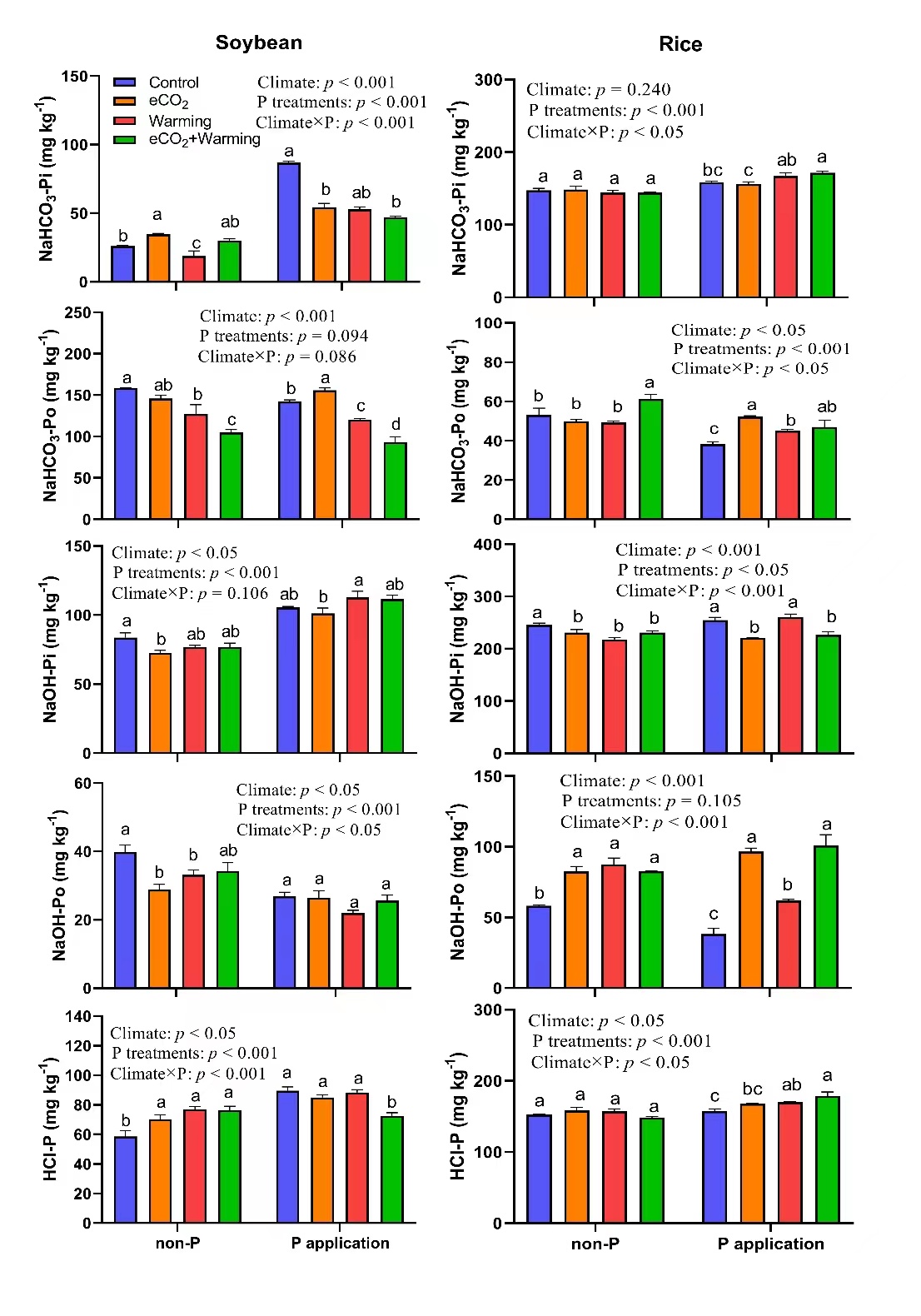 氣候變化深刻影響農(nóng)田生態(tài)系統(tǒng)養(yǎng)分循環(huán)。磷素(P)作為農(nóng)田生態(tài)系統(tǒng)中第二重要的植物營養(yǎng)元素,能夠調(diào)節(jié)作物對(duì)氣候變化的適應(yīng)性。因此,研究作物磷吸收和土壤磷動(dòng)態(tài)對(duì)氣候變化下維持農(nóng)業(yè)生態(tài)系統(tǒng)可持續(xù)性至關(guān)重要。然而,大氣CO2濃度和溫度升高對(duì)作物生長(zhǎng)和土壤磷組分的影響,以及相關(guān)微生物機(jī)制鮮有研究。