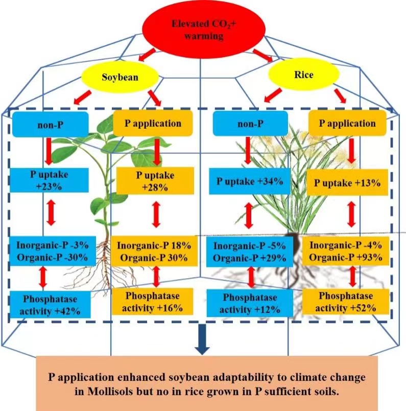 中國科學(xué)院東北地理與農(nóng)業(yè)生態(tài)研究所農(nóng)田分子生態(tài)學(xué)科組研究人員,利用開頂式氣候室(OTC)模擬大氣CO2濃度和溫度升高,種植大豆和水稻在施磷肥和不施磷肥條件下作物磷吸收及根際土壤磷轉(zhuǎn)化相關(guān)微生物分子生態(tài)特征。研究發(fā)現(xiàn),在施磷肥和不施磷肥條件下,大氣CO2濃度和溫度升高分別增加大豆磷吸收23%和29%,水稻磷吸收34%和13%。因此,施磷條件下大豆磷吸收對(duì)氣候變化的響應(yīng)更為明顯,而水稻則是在不施磷條件下更為顯著。而且,大氣CO2濃度和溫度同時(shí)升高降低大豆根際土壤有機(jī)磷含量,卻增加水稻根際土壤有機(jī)磷含量(圖1)。大豆根際有機(jī)磷含量與酸性磷酸酶活性呈負(fù)相關(guān)關(guān)系,然而在水稻根際呈正相關(guān)關(guān)系。因此,氣候變化影響大豆根際土壤磷轉(zhuǎn)化以有機(jī)磷礦化為主,而水稻則以磷固定為主。此外,大氣CO2濃度和溫度同時(shí)升高增加了大豆施磷土壤磷轉(zhuǎn)化相關(guān)基因豐度,如phoD(堿性磷酸酶合成基因)、phoC(酸性磷酸酶合成基因)、pstS(磷酸鹽特異性轉(zhuǎn)運(yùn)蛋白酶)和phnX(磷酸酯酶基因),提出大豆根際有機(jī)磷的礦化是磷轉(zhuǎn)化的主要生物學(xué)過程,而水稻根際土土壤磷轉(zhuǎn)化主要以磷固定為主,而且根際土壤有效磷主要來自于無機(jī)磷的活化(圖2)。此研究揭示了作物—土壤—微生物系統(tǒng)磷循環(huán)的相關(guān)機(jī)理,為氣候變化條件下不同作物磷肥管理策略提供了理論基礎(chǔ)。
