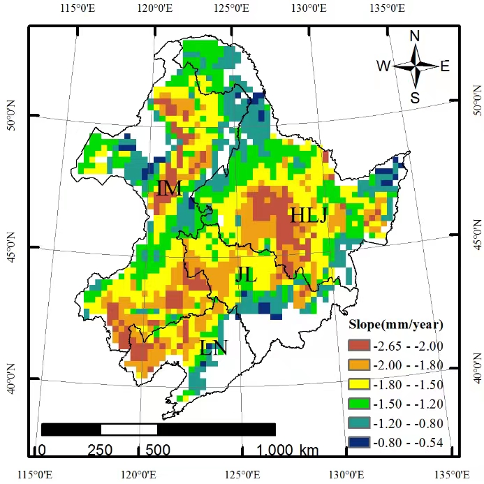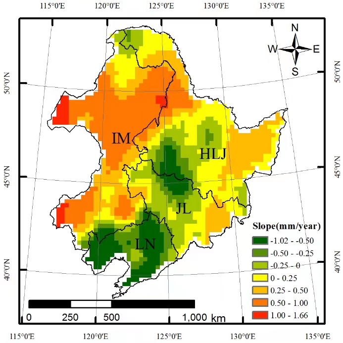 圖1東北地區(qū)玉米根區(qū)0-200 cm深度范圍土壤水分時間變化率的空間分布特征