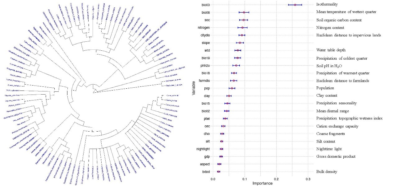 圖1. 中國內(nèi)陸沼澤濕地優(yōu)勢種發(fā)育關(guān)系及各環(huán)境因子重要性