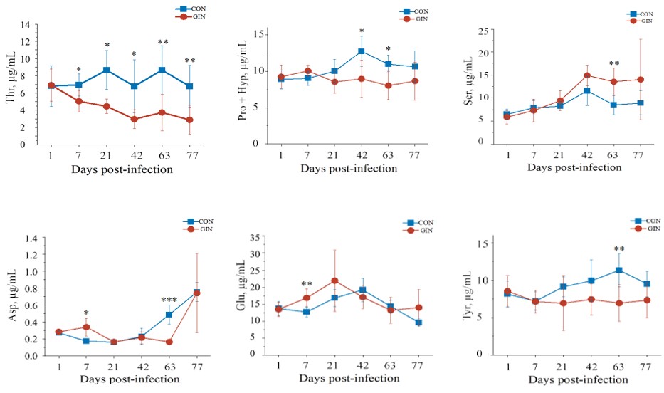 圖1 Haemonchus contortus感染對宿主羔羊血漿氨基酸濃度的影響(部分)