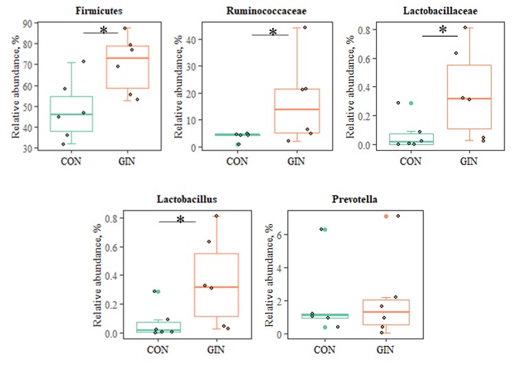 為此,中國科學院東北地理與農(nóng)業(yè)生態(tài)研究所草地農(nóng)牧業(yè)學科組成員研究了H. contortus感染對宿主羔羊蛋白質消化、氨基酸代謝、胃腸道微生物組成的影響。研究發(fā)現(xiàn):H. contoutus 感染降低了羔羊采食量和日糧營養(yǎng)物質的表觀消化率(尤其是日糧中蛋白質和脂質的表觀消化率),并降低了羔羊的生長性能。羔羊蛋白質吸收受到影響,瘤胃胃蛋白酶和回腸胰蛋白酶活性顯著降低,血漿氨基酸譜變化顯著。例如,宿主羔羊血漿中蘇氨酸和脯氨酸濃度顯著下降,血漿中天冬氨酸、谷氨酸、絲氨酸和酪氨酸濃度顯著增加,從而彌補由于H. contortus 定植、發(fā)育和繁殖造成的宿主羊蛋白質和氨基酸損失(圖1)。感染H. contortus的羔羊的生理代謝和血液生化指標的改變與胃腸道微生物群落組成密切相關。與未感染羊相比,感染羊胃腸道中與碳水化合物、蛋白水解相關的菌屬豐度顯著增加,例如Firmicutes、Ruminococcoceae、Lactobacillaceae、Lactobacillus以及Prevotella等(圖2), 并且羔羊胃腸道中與蛋白質、碳水化合物以及脂肪等營養(yǎng)物質代謝相關的KEGG通路均顯著增加(表1)。本研究結果為系統(tǒng)解析GINs感染和寄生與宿主羊營養(yǎng)代謝的關系提供了理論依據(jù)。