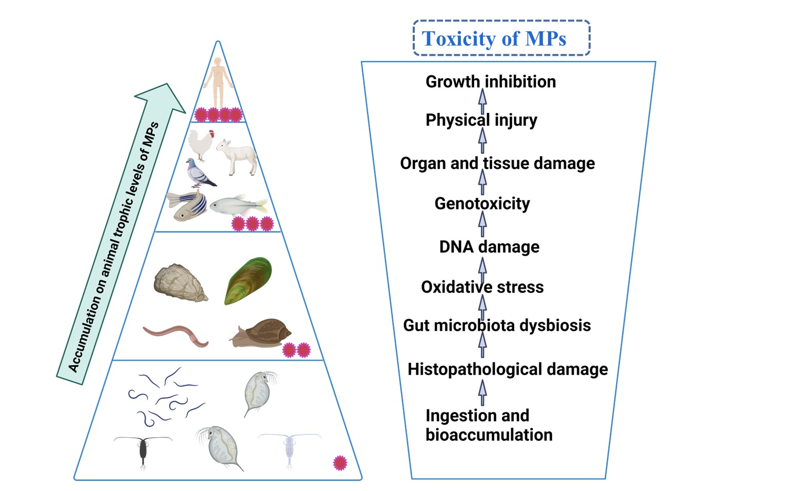 圖3 微塑料在動(dòng)物不同營(yíng)養(yǎng)級(jí)水平上的轉(zhuǎn)運(yùn)和毒性