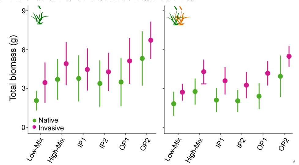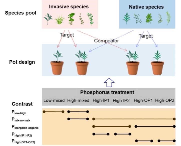基于以上研究背景,中科院東北地理所生物入侵生態(tài)學(xué)團(tuán)隊(duì)與安徽農(nóng)業(yè)大學(xué)資源與環(huán)境學(xué)院生態(tài)學(xué)團(tuán)隊(duì)合作,將5對(duì)同屬的外來(lái)入侵植物與本地植物單獨(dú)種植以及相互競(jìng)爭(zhēng)種植在一起,并施加以下6種不同的土壤磷處理(圖1):1、低可利用性水平混合磷處理(low-mixed);2、高可利用性水平混合磷處理(high-mixed);3、高可利用性水平磷酸氫鈣處理(IP1);4、高可利用性水平磷酸鋁處理(IP2);5、高可利用性水平植酸處理(OP1);6、高可利用性水平磷酸腺苷二鈉鹽處理(OP2)。實(shí)驗(yàn)結(jié)束之后,測(cè)定植物的地上地下生物量,對(duì)比研究入侵植物與本地植物對(duì)不同可利用性水平與不同形態(tài)土壤磷的響應(yīng)差異。