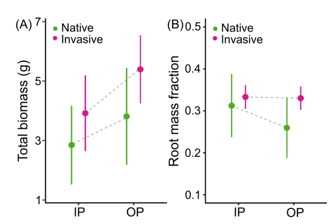 圖3 無(wú)機(jī)磷(IP)與有機(jī)磷(OP)處理下本地植物與入侵植物的總生物量和根生物量占比