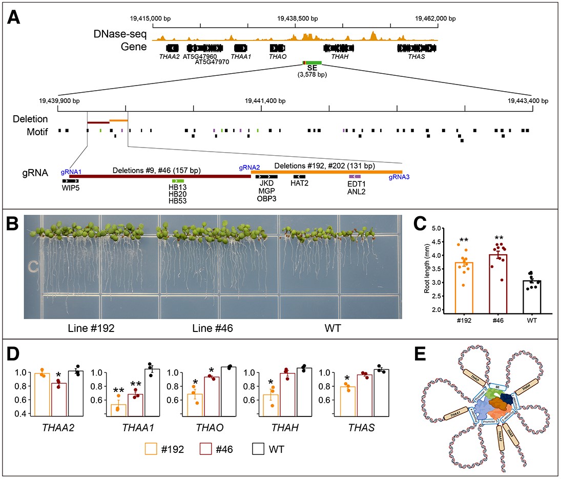 孟凡立研究員團(tuán)隊(duì)利用擬南芥DNase I超敏感位點(diǎn)測(cè)序數(shù)據(jù),在擬南芥全基因組范圍內(nèi)查找含有大的增強(qiáng)子簇的染色質(zhì)開放區(qū)域,鑒定出749個(gè)候選超級(jí)增強(qiáng)子,最小的長(zhǎng)度為1.5Kb。超級(jí)增強(qiáng)子所在基因組區(qū)域比其他啟動(dòng)子染色體開放區(qū)域?qū)Nase I更敏感。超級(jí)增強(qiáng)子與拓?fù)潢P(guān)聯(lián)域(TAD)緊密相關(guān)聯(lián)(圖1)。SEs及其預(yù)測(cè)靶基因與擬南芥器官和組織發(fā)育密切相關(guān)。這些研究結(jié)果證明擬南芥超級(jí)增強(qiáng)子與哺乳動(dòng)物超級(jí)增強(qiáng)子具有相同的功能特征。在由五個(gè)基因組成thalianol生物合成基因簇(BGC)中間定位了一個(gè)長(zhǎng)3578 bp超級(jí)增強(qiáng)子,并利用CRISPR/Cas技術(shù)創(chuàng)制超級(jí)增強(qiáng)子的突變體。超級(jí)增強(qiáng)子中131-157 bp小片段缺失顯著抑制基因簇中五個(gè)基因轉(zhuǎn)錄,導(dǎo)致擬南芥根明顯變長(zhǎng)(圖2)。此外,SE區(qū)域中T-DNA插入也導(dǎo)致基因簇五個(gè)基因轉(zhuǎn)錄改變。該研究結(jié)果表明超級(jí)增強(qiáng)子在擬南芥組織發(fā)育特性相關(guān)基因表達(dá)和類操縱子基因簇基因共表達(dá)中發(fā)揮著重要作用。