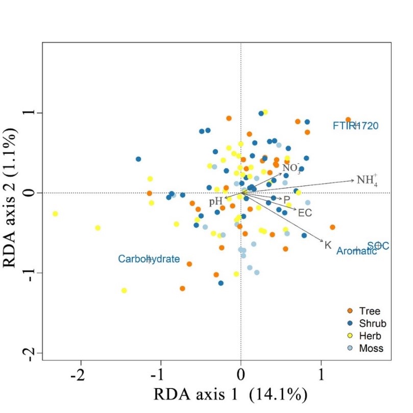 圖1. 多年凍土區(qū)泥炭沼澤不同植被群落下表層泥炭土壤有機質化學結構與營養(yǎng)元素關系冗余分析。