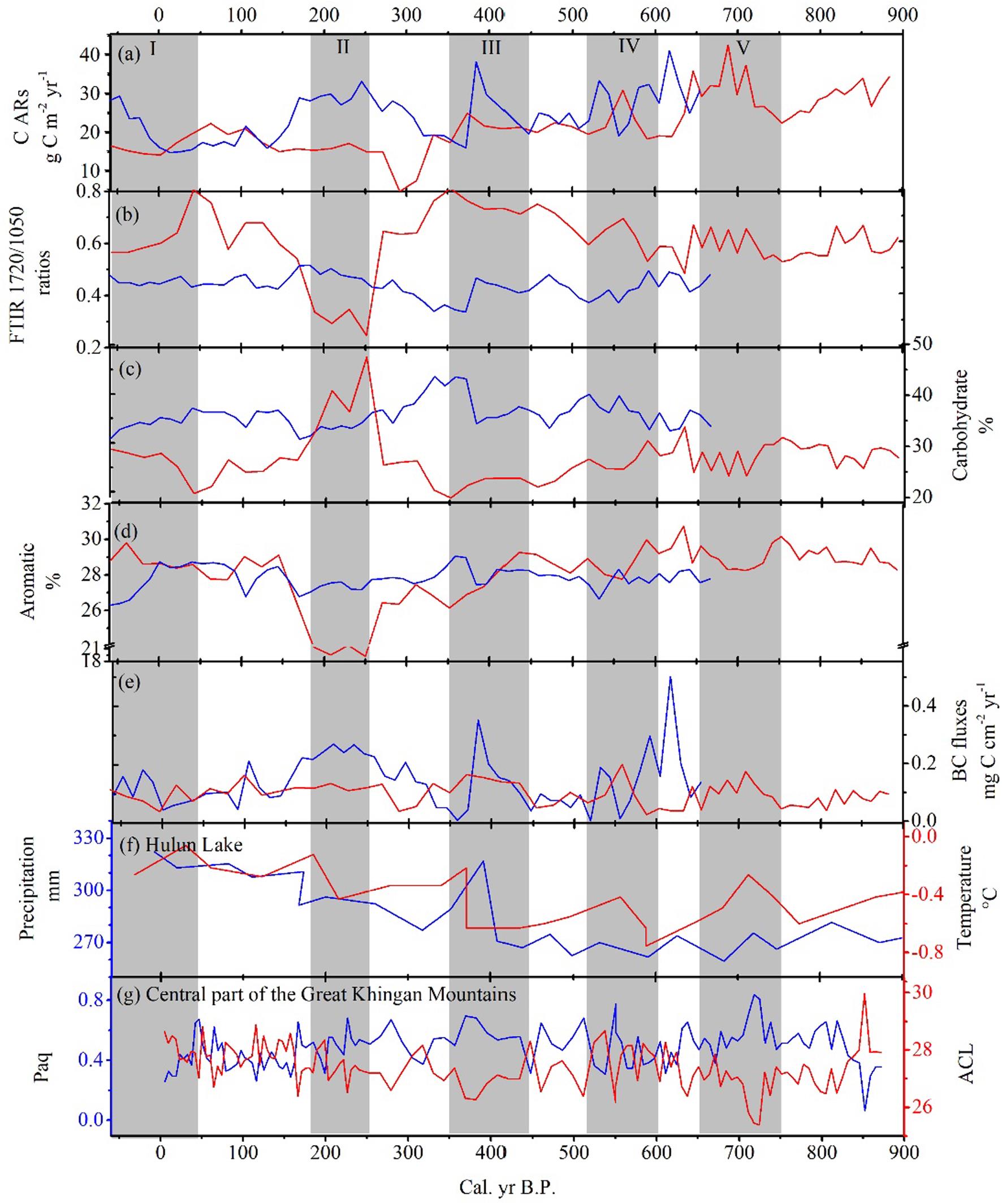 過去千年以來,局部降水和火擾動的差異有可能是引起泥炭沼澤碳庫穩(wěn)定性產(chǎn)生變化的主要因素(圖2)。特別是在距今250-200年, 高強度的火擾動促使更多草本的生長并導致這一時期累積的植物凋落物中含有較高含量的多糖類化合物,并導致勁濤(JT)泥炭沼澤在這一時期累積了更多的多糖類化合物和較低的芳香族化合物,并高于宏圖(HT)泥炭沼澤。而在其他時期, HT泥炭沼澤碳庫中多糖類化合物明顯高于JT泥炭沼澤,而芳香族化合物在兩個泥炭柱芯中相近,并推測降水差異是導致HT泥炭沼澤土壤碳庫穩(wěn)定性略低于JT泥炭沼澤。
