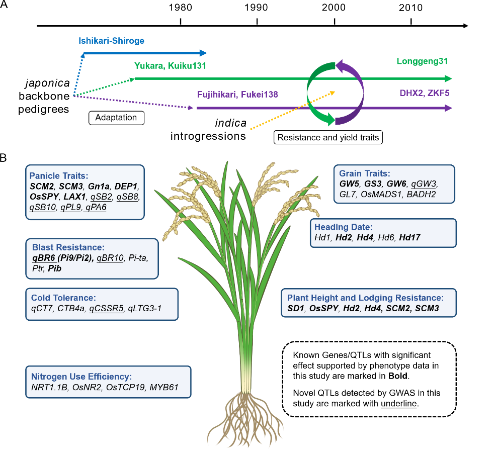 研究團隊收集了涵蓋東北稻區(qū)自1940年代到2010年代選育或引種的546份水稻品種資源,進行了重測序和22個農(nóng)藝性狀表型的調(diào)查。研究發(fā)現(xiàn)東北地區(qū)水稻品種可歸類到3個具有不同進化特征的亞群(圖1),以石狩白毛為骨干的K3G1亞群在上世紀80年代前的黑龍江品種中占主導地位,隨后被以蝦夷和空育131為骨干的K3G2亞群取代;而以富士光和藤系138為骨干的K3G3亞群主要分布在遼寧和吉林,但隨著時間推移,其在黑龍江省的占比也越來越高。同時確認了秈稻滲入對東北水稻稻瘟病抗性和穗部性狀的重要貢獻。將品種選育印記追溯到123個已知或新檢測到的QTL位點以及大量秈稻滲入片段,系統(tǒng)總結(jié)了一些具有年代特征的關(guān)鍵性QTL位點或滲入片段,為后繼的品種設計選育提供了依據(jù)(圖1)。