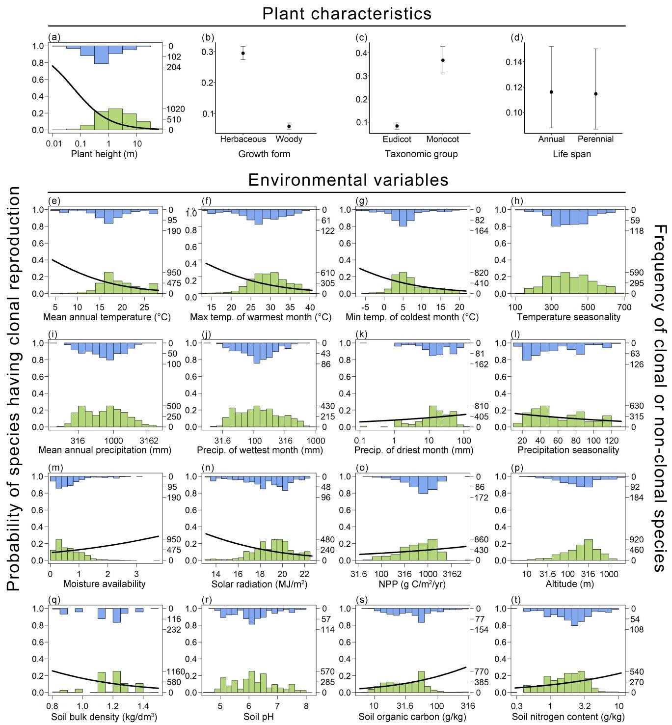 研究結(jié)果表明,克隆植物的概率與植物特征的關(guān)系更強(qiáng)烈,與環(huán)境變量的關(guān)系相對(duì)較弱。矮小植物、草本、單子葉植物更可能進(jìn)行克隆繁殖,并且克隆植物在低溫、低太陽輻射、高水分供應(yīng)、高凈初級(jí)生產(chǎn)力和高土壤有機(jī)碳和氮含量的環(huán)境中更常見。高大植物、木本、雙子葉植物通常只能有性繁殖,并且非克隆植物在干燥和土壤貧瘠的環(huán)境中更常見。這一重要發(fā)現(xiàn)將推進(jìn)人們對(duì)植物繁殖策略大尺度格局及兩種繁殖方式進(jìn)化意義的理解,表明克隆繁殖是植物在資源豐富的環(huán)境下進(jìn)行種群擴(kuò)張的策略,而不是在環(huán)境脅迫條件下替代有性繁殖的保障策略。