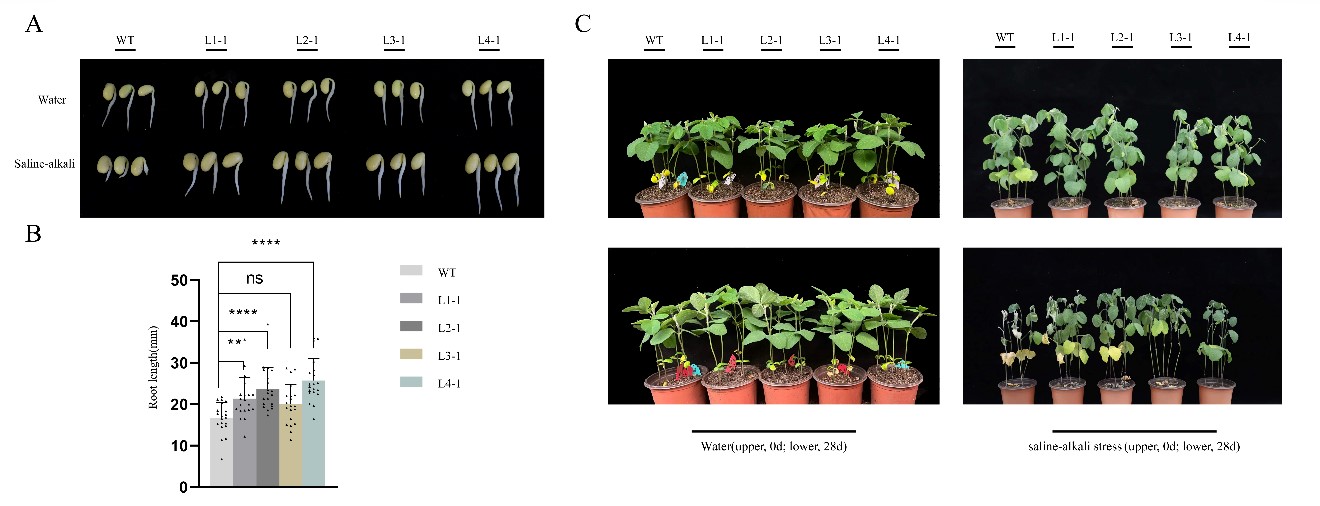 圖1. 過表達(dá)AhALDH3H1基因提高大豆芽期和苗期鹽堿耐受性