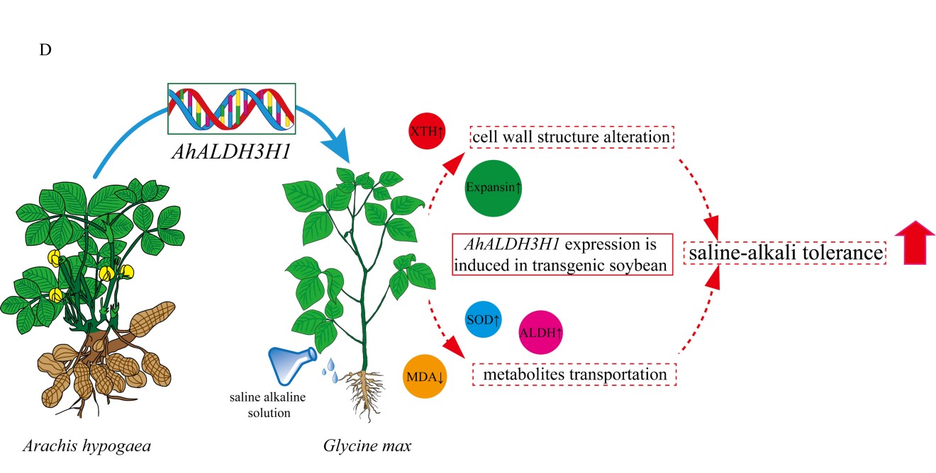 東北地理所農(nóng)田有害生物控制學(xué)科組孟凡立研究團(tuán)隊(duì)成員將來自于花生ALDH家族的AhALDH3H1基因成功轉(zhuǎn)入大豆受體中,發(fā)現(xiàn)在大豆基因組中過表達(dá)AhALDH3H1可以顯著增加轉(zhuǎn)基因大豆耐鹽堿能力(圖A-C)。轉(zhuǎn)錄組和代謝組分析表明,過表達(dá)AhALDH3H1一方面通過調(diào)控包括木葡聚糖內(nèi)轉(zhuǎn)糖苷酶水解酶(XTH)和擴(kuò)張蛋白(Expansin)在內(nèi)的細(xì)胞壁組成成分相關(guān)的重要基因,減少了鹽堿脅迫對(duì)轉(zhuǎn)基因大豆植株損害。另一方面,在抵御脅迫的過程中產(chǎn)生的SOD、MDA和ALDH,通過ABC transporter轉(zhuǎn)運(yùn)途徑被成功轉(zhuǎn)運(yùn),維持細(xì)胞穩(wěn)態(tài)。本研究在大豆中過表達(dá)了花生的AhALDH3H1基因,獲得了耐蘇打鹽堿的轉(zhuǎn)基因大豆材料,明確了該基因過表達(dá)提高大豆耐鹽堿的機(jī)理,為大豆耐蘇打鹽堿育種提供理論依據(jù)及新的思路(圖D)。