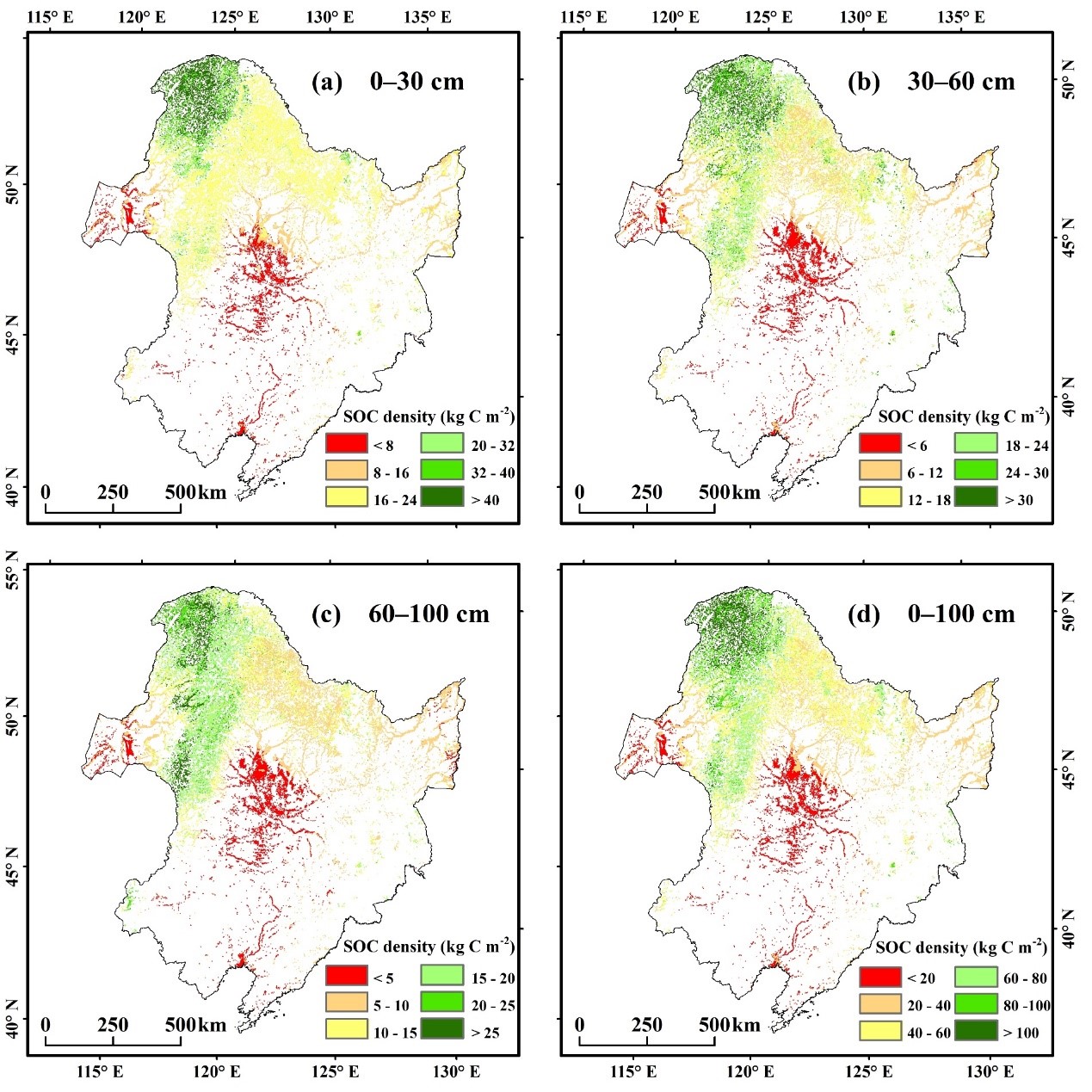 研究結(jié)果表明:基于地形、氣候和植被等因子,利用機(jī)器學(xué)習(xí)模型能夠較好地預(yù)測不同深度的濕地土壤有機(jī)碳密度。東北地區(qū)濕地土壤有機(jī)碳平均密度為44.30 ±1.72 kg C m?2,隨著土壤深度的增加,土壤有機(jī)碳密度逐漸降低,土壤有機(jī)碳密度在空間上在由北向南逐漸減小。東北地區(qū)濕地土壤有機(jī)碳儲(chǔ)量豐富,濕地土壤有機(jī)碳總儲(chǔ)量為3.40±0.13 Pg C;在不同地區(qū)中,大興安嶺地區(qū)濕地有機(jī)碳儲(chǔ)量最高。基于相關(guān)性和模型重要性的分析結(jié)果表明,不同深度濕地土壤有機(jī)碳密度受環(huán)境因子影響的程度互有差異,濕地表層(0–30 cm)土壤有機(jī)碳密度更易受氣候變化的影響。研究結(jié)果對于深入理解濕地土壤碳庫對氣候變化的響應(yīng)具有重要意義。