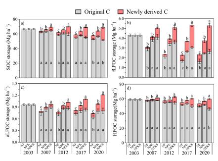 圖1. 2003-2020年間不同施肥方式下土壤及其組分中新、老碳的儲(chǔ)量變化