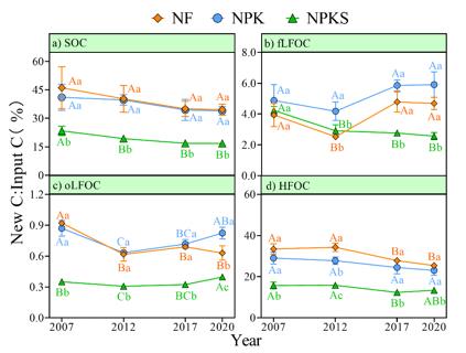 圖2. 2003-2020年間不同施肥方式下外源碳在全土和有機(jī)碳組分中的轉(zhuǎn)化率